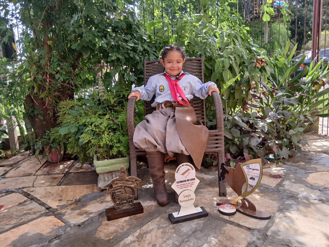 Com talento incrível na vaca parada, a menina tem cerca de 30 troféus, colecionados em eventos tradicionalistas. No ano passado conquistou classificação estadual para o 16ª FENART, a 21ª Festa Campeira Nacional de Campeões e os 11º Jogos Tradicionais, em Goiás, mas a família não conseguiu viajar para participar.