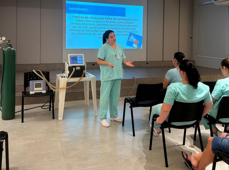 Durante a capacitação, foram abordados temas como Modos ventilatórios, Ajustes e parâmetros, Manuseio correto dos equipamentos e Cuidados essenciais com o paciente.