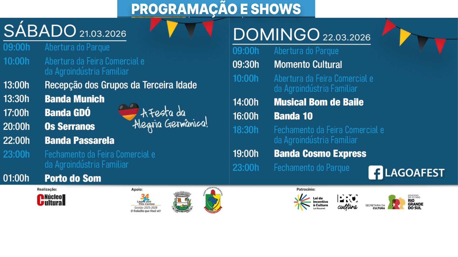 O prefeito Sérgio Lasch recepcionou autoridades locais, entre elas a presidente do Núcleo Cultural, Nilve Vera Maldaner, regionais, representantes do Governo do Estado, da Assembleia Legislativa, e os deputados estadual Dirceu Franciscon e federal Luiz Carlos Bussato, ambos do União Brasil. Conhecida como A Festa da Alegria Germânica, a Lagoa Fest reproduzi a essência do espirito dos imigrantes alemões que colonizaram a município, de acordo com o chefe do executivo.