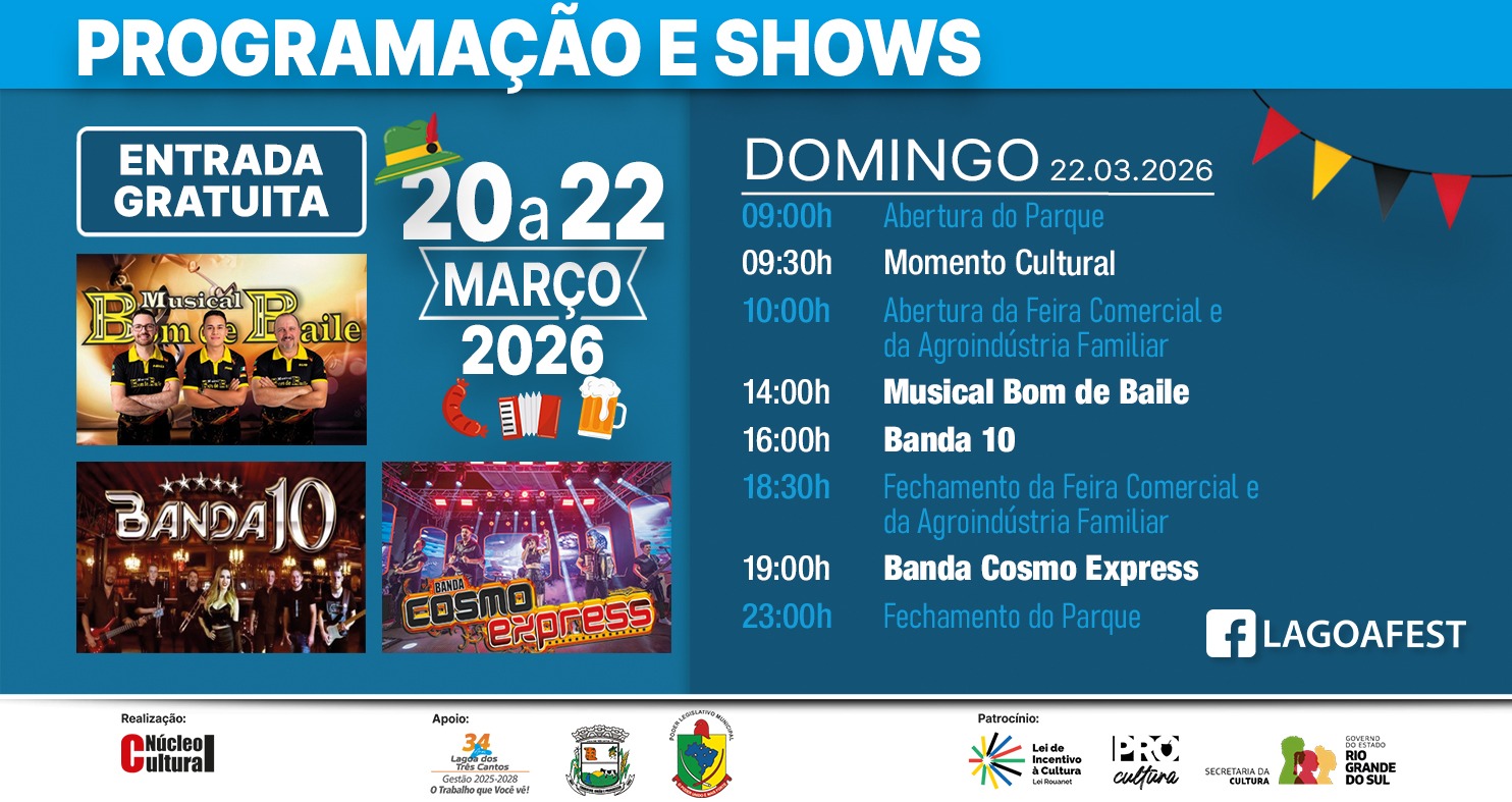 Este domingo (22), é o último dia de programação. A Lagoa Fest encerra às 23h.