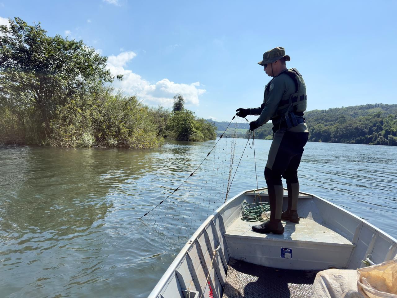Nesse contexto, equipes do 3º BPAmb realizaram patrulhamento aquático e terrestre nos rios Uruguai e da Várzea, na área do município de Iraí. Durante as ações de navegação, os policiais militares retiraram do ambiente aquático cerca de 300 metros de redes de pesca e 12 “boias-loucas”, petrechos introduzidos de forma irregular nas águas. Ainda às margens do Rio Uruguai, foram localizados aproximadamente 1.200 metros de redes de pesca, ocultos em meio à vegetação ribeirinha.